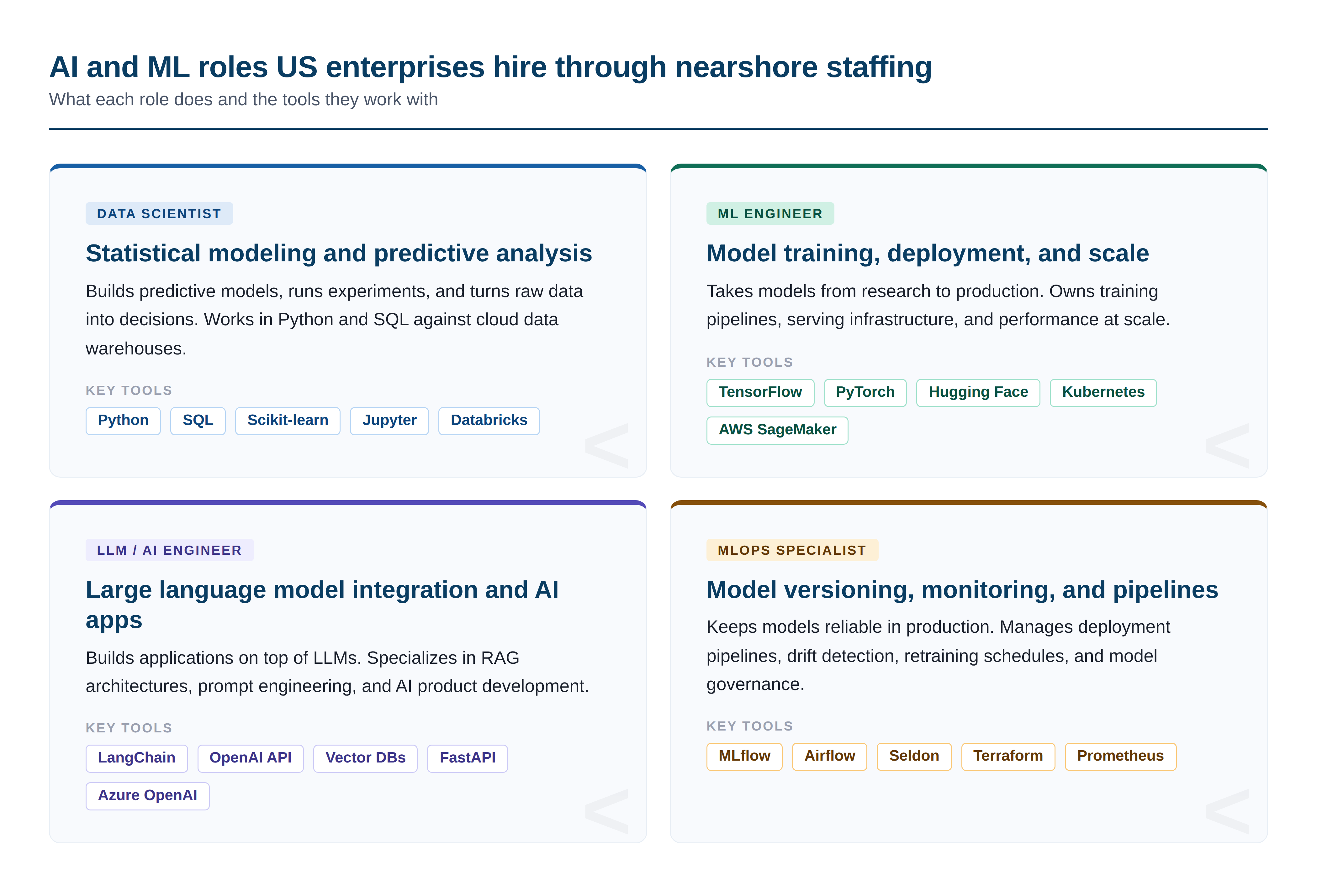 The phrase “data engineering team” covers considerably more ground than it did five years ago. It used to mean people who moved data from one place to another. Today, a functional team touches pipeline architecture, cloud infrastructure, analytics modeling, machine learning, and increasingly, the AI systems built on top of all of it. Before hiring for any of these roles nearshore, it helps to be clear on what you are building.